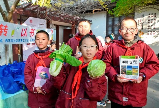 活动采购的蔬果大多是助农产品,既助力农民销售,又赋予物物交换更多意义。每周的活动现场,实践点都招募了不少志愿者,耐心解答市民疑问、认真整理书籍,在服务他人的过程中传递温暖。目前,“以书换蔬”活动共计开展18次,吸引近千名市民参与,收到捐赠书籍800余册。不少小学还组织学生集体前来参与活动。此外,实践点还定制了2000个印有“书香流转以书换蔬”的主题购物袋,赠送给前来参与活动的市民。